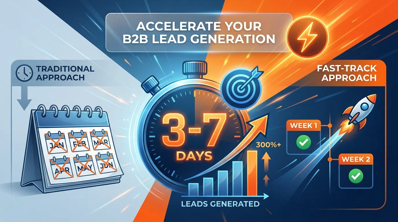 Timeline infographic showing traditional 60-90 day lead generation vs fast-track 7-14 day approach with key milestones